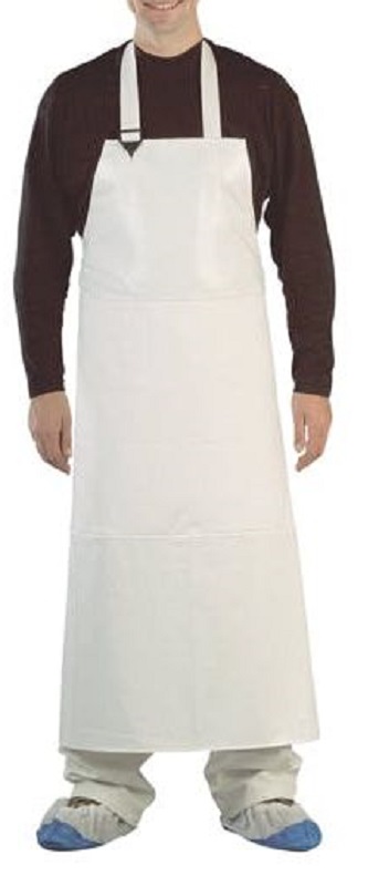 CARACTERISTIQUES Protection contre les éclaboussures Résiste aux graisses animales, aux produits d’entretien courants Résiste à l’acide chlorhydrique à 30% et à l’eau de javel à 40° chlorométrique Très lisse Se nettoie facilement et ne durcit pas Montage standard par une sangle sur le cou Polyuréthane sur support PVC Coloris blanc Dimensions : 120 x 90 cm Epaisseur : 0,44 mm Poids : 320 g/m²